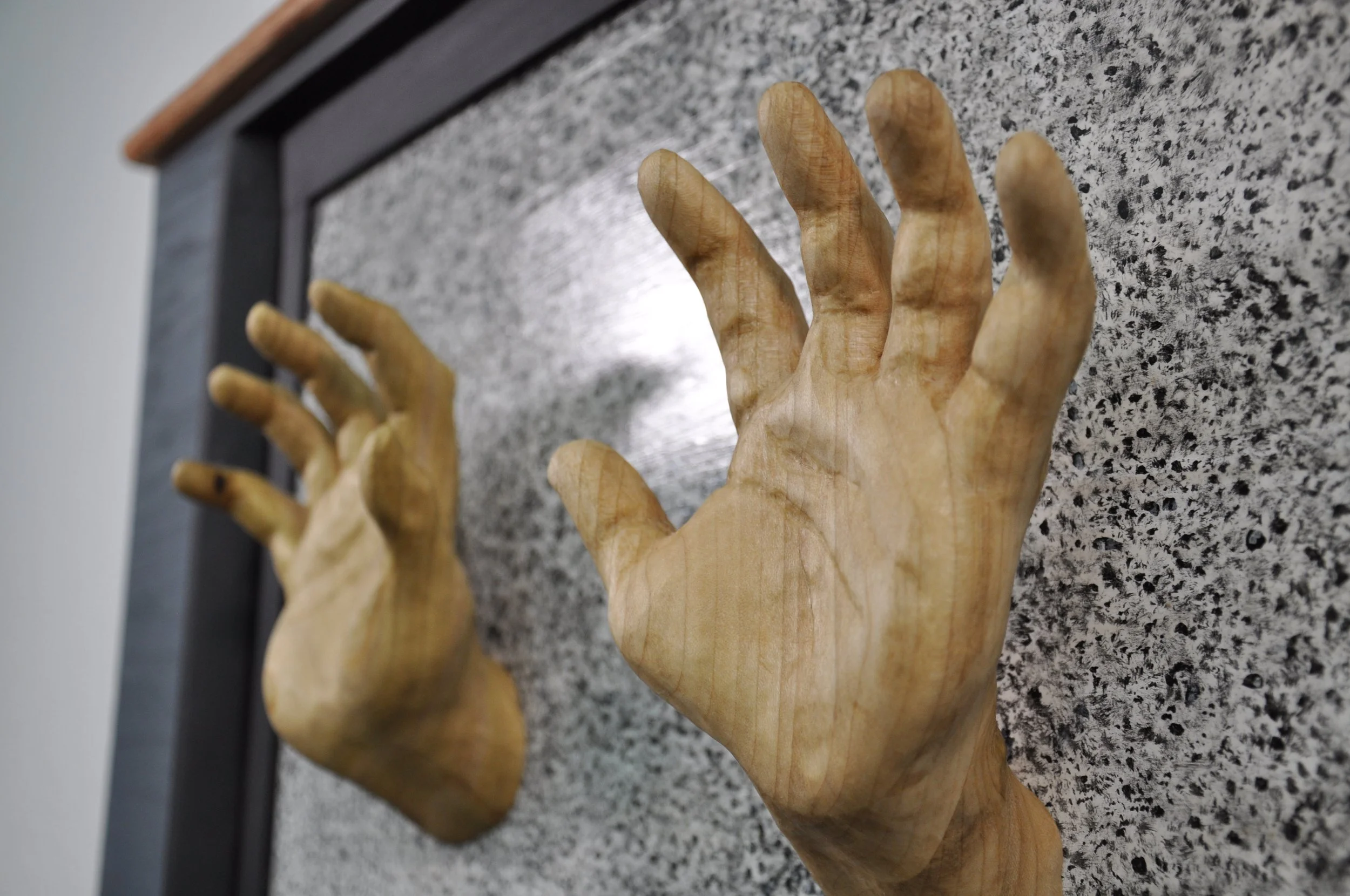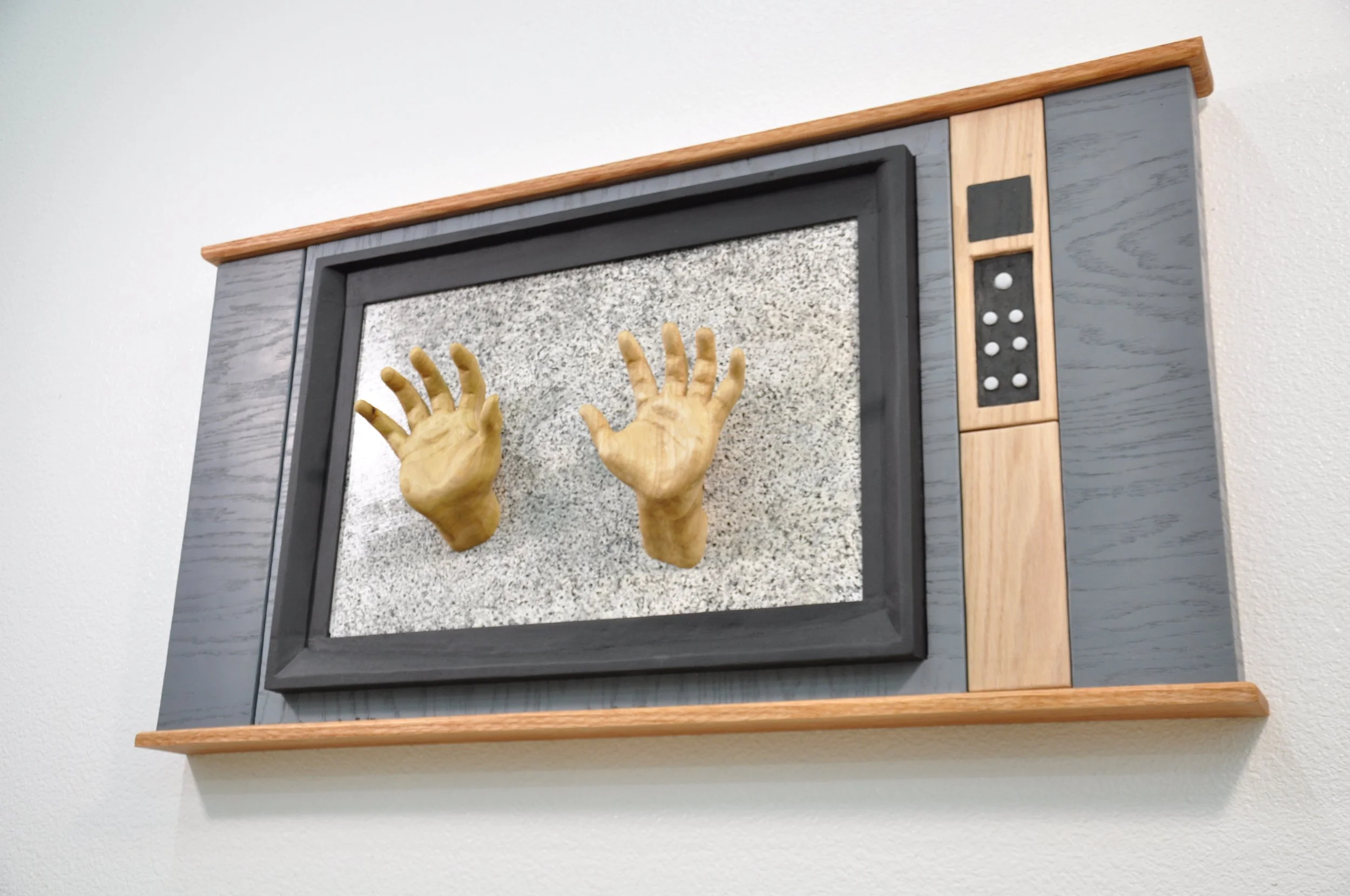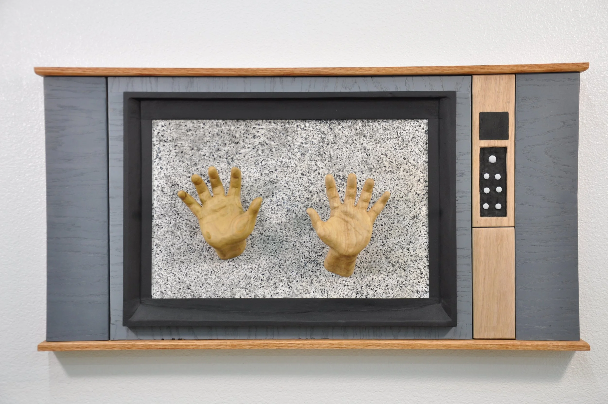 This wall piece was inspired by the movie Poltergeist. It features hand carved wooden hands, and the entire tv was made by hand and painted and finished.